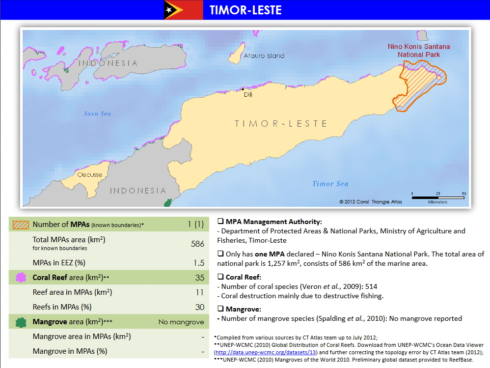 After achieving its independence in 2002, Timor-Leste promptly recognized its responsibility to steward its waters, which lie in the Coral Triangle - the global center of marine biological diversity. Since becoming a sovereign state, Timor-Leste has become a signatory of The Convention on Biological Diversity (CBD), the United Nations Framework Convention on Climate Change (UNFCCC), the Arafura and Timor Seas Expert Forum (ATSEF), Partnerships in Environmental Management for the Seas of East Asia (PEMSEA) and the Coral Triangle Initiative (CTI).